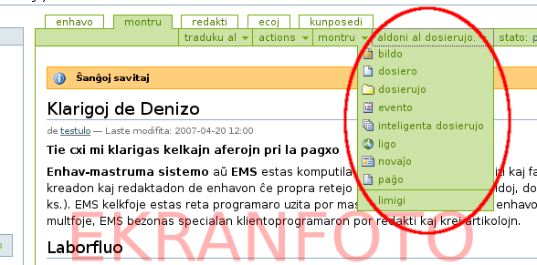 Per la "aldonmenuo" vi povas aldoni elementojn al la dosierujo en kiu vi estas. Ekz. vi povus eniri la "reteja bildujo" kaj poste elekti "aldoni al dosierujo" -> kaj sekve "bildo". Per la sama menuo eblas enmeti paĝojn, novaĵojn, dosierujojn, ktp.