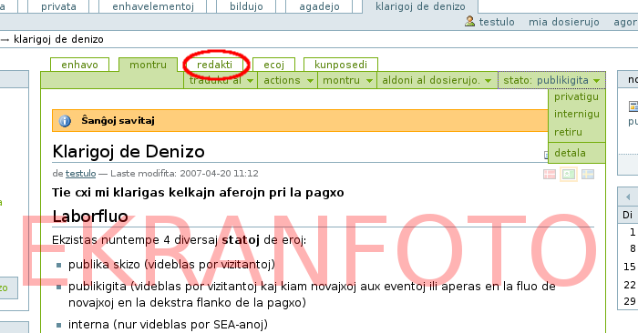 Per la butono "redakti" vi povas redakti la enhavon de la nuna ero. Ekzemple se vi deziras redakti la ĉefpaĝon (la titolpaĝon) vi iru tien kaj elektos na "redakti".